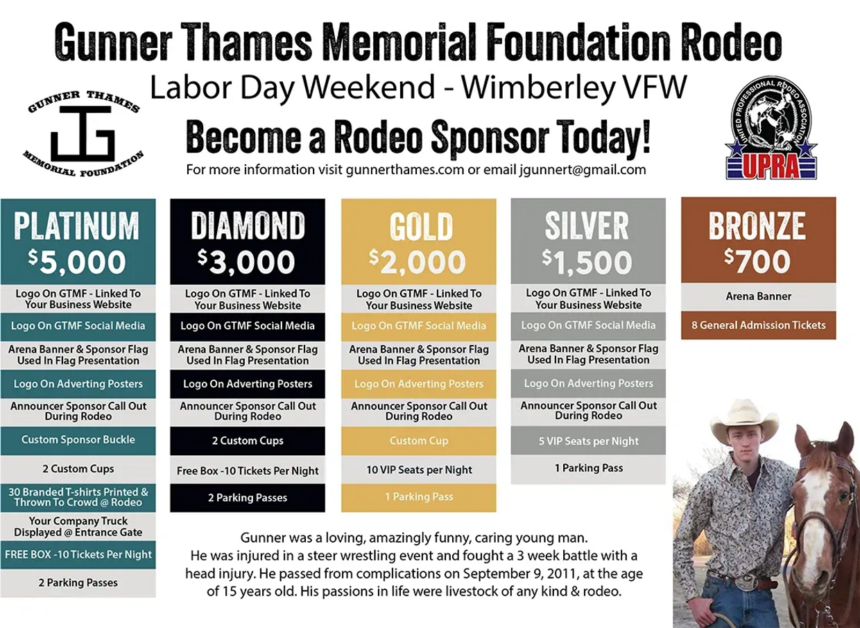 Above are the packages that we offer for the 2024 Gunner Thames Memorial Rodeo in Wimberley, Texas. We love having the Gunner Thames Rodeo at the Wimberley VFW.